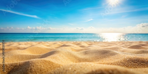 Close-up sandy beach with blurred sea and sky background on a sunny summer day, peaceful nature scene with empty space for text copy, relaxing coastal vacation concept
