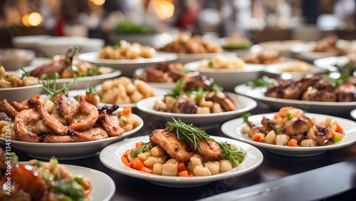 Close-up several white plates filled delicious roasted chicken pieces vegetable sides a catered event.