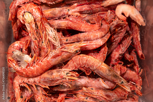 Close-up shooting of seafood. Photo of shrimp in the supermarket.