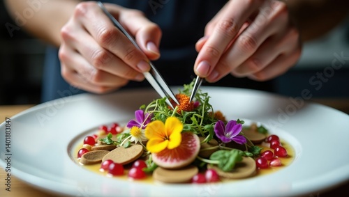 Close-up shot of a chef’s hands carefully plating gourmet food on a white ceramic dish, tweezers in hand, with colorful ingredients, soft diffused kitchen lighting and a shallow depth of field