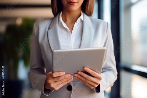 Close-up shot of a confident businesswoman delivering a compelling corporate presentation using a tablet. The focus is on her hands and the tablet screen. Generative Ai.