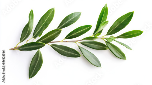 Close-up shot of a fresh olive twig with bright green leaves on a white background, perfect for natural designs
