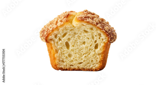 Close-up shot of a freshly baked crumb cake showcasing its moist and airy texture; a delightful treat to savor.