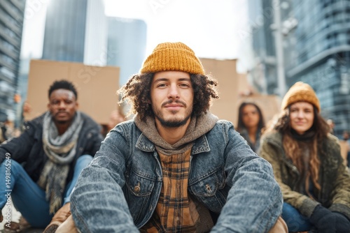 Close-up shot of a group of young diverse protesters sitting in the city center holding signs, fighting for rights and social justice with serious determination and passion.