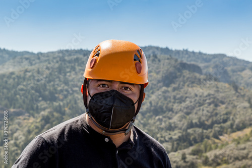Closeup shot of a male rock climber on the top of the mountain in a facial mask