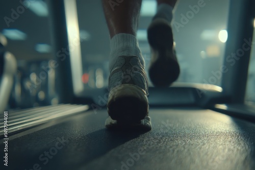 Close-up shot of a person running on a treadmill at the gym, focusing on their feet and shoes, showcasing fitness and exercise concept and blurred background.
