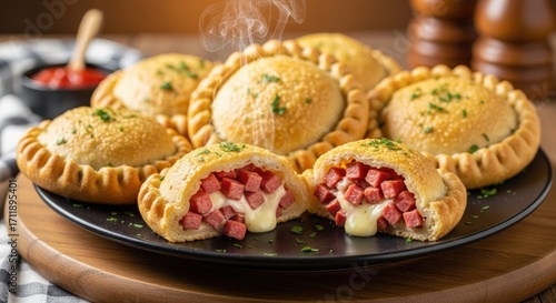 Close-up shot of a plate with several baked empanadas, one cut open to show the filling.