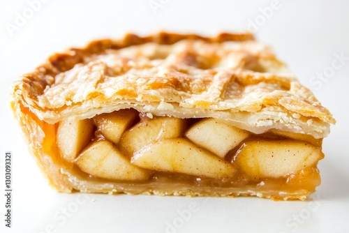 close-up shot of an apple pie slice, with the flaky crust and golden apples visible inside, set against a white background for contrast