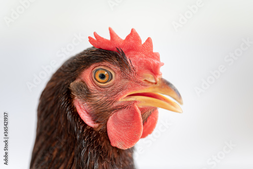Close-up shot of brown hen's face.