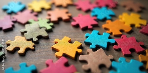 Close-up shot of colorful jigsaw puzzle pieces scattered on a wooden surface, some fitting together, others separated, suggesting confusion and incompleteness , colors, colorful, top view