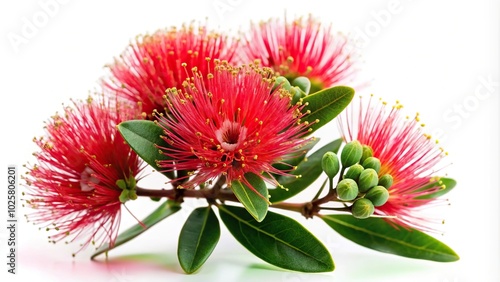 Close-up shot of isolated Metrosideros flowers on white background