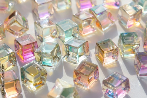 Close-up shot of multiple iridescent glass cubes arranged on a reflective surface creating a colorful display with soft lighting and blurred background