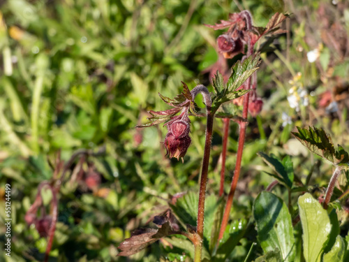 Close-up shot of nodding red flower of water avens (Geum rivale) growing in a green meadow surrounded with wild flowers in spring