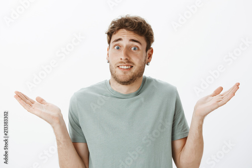 Close-up shot of questioned awkward handsome male in earrings, shrugging and spreading palms cluelessly, being unaware and knowing nothing what to do, standing over gray background