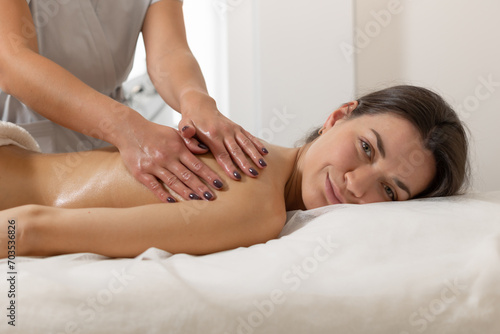 Closeup Shot Of Therapist Lady Massaging Back Of Attractive Mature