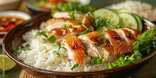 Close-up shot of traditional chicken rice showcased in a studio environment.