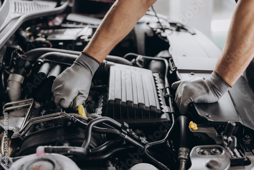 Close-up shot of unrecognisable man wearing gray glove inspecting car engine and interior of hood of car