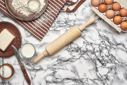 Close-up shot. Top view of a baking ingredients and kitchenware on the marble table background.