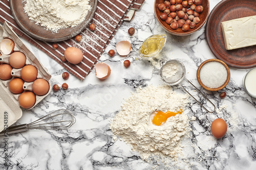 Close-up shot. Top view of a baking ingredients and kitchenware on the marble table background.