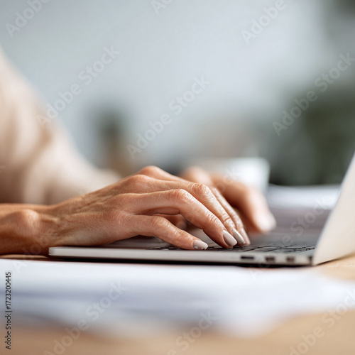 Closeup showcases hands typing on a laptop. Symbolizes productivity, remote work, digital communication, or online learning. Evokes focus, efficiency, and technological skill.
