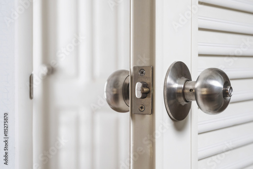 Close-up stainless door knob, with door open slightly