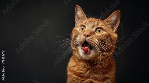 Closeup Surprised Ginger Cat with opened Mouth on Black background
