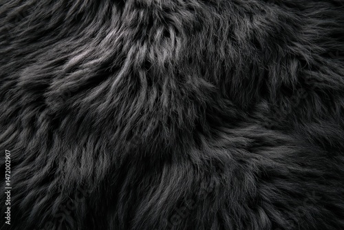 Close-up texture of thick, black animal fur with soft, wavy patterns.