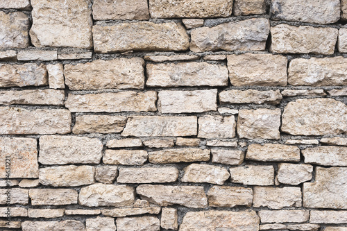Close-up textured background is an irregular natural stone wall made of different stones without a cement-type bonding mixture. Medieval background