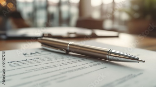 Closeup the silver ballpoint modern pen on insurance contract with planning in background.