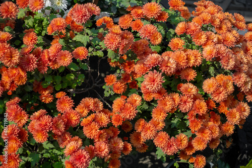 Close-up top view of orange chrysanthemum flowers in the roof garden. Orange chrysanthemum flower pattern background.