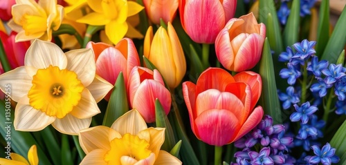 Close-up vibrant spring blossoms, daffodils, tulips, hyacinths labeled with botanical names, bulb, close-up, flowering plant