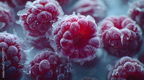 Close-up view captures fresh frozen raspberries with crystalline frost texture, displaying vibrant red berries against moody dark background with natural lighting effects.