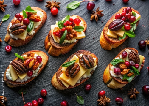 Close-up view: Gourmet crostini, showcasing apples, brie, cranberries, and pecans.