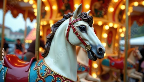 Close-up view, intricately carved carousel horse, smooth, handmade, design