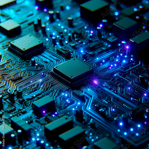 Close-up view of a circuit board, rendered in a highly detailed and stylized manner.