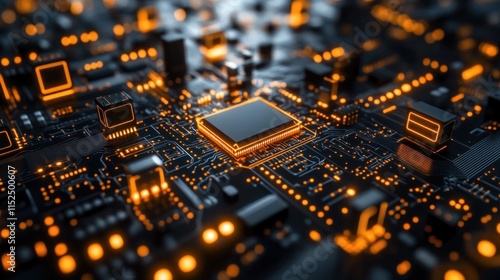 Close-up view of a circuit board with a central processor chip, highlighted by orange light, showcasing complex electronic components.