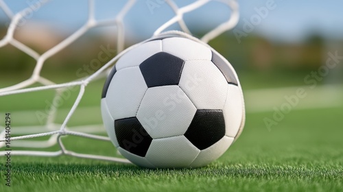 Close-Up View of a Classic Black and White Soccer Ball Nestled in a Goal Net on a Sunlit Green Field, Perfect for Sports-Themed Projects and Promotions