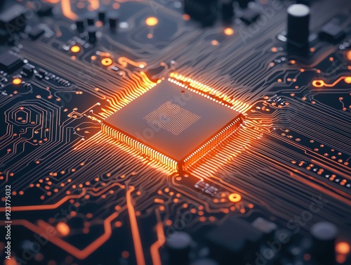 Close-up view of a computer chip glowing with orange light, highlighting the intricate circuit design and technology.