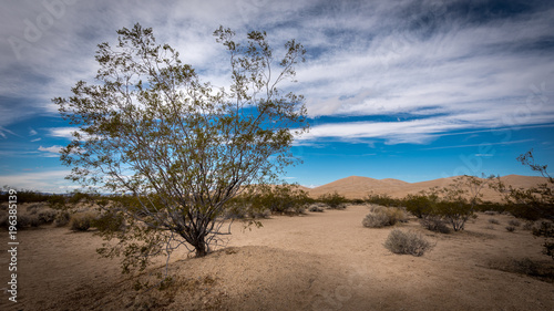 Closeup view of a creosote bush in the desert landscape at the Mohave National Preserve in Kelso, California