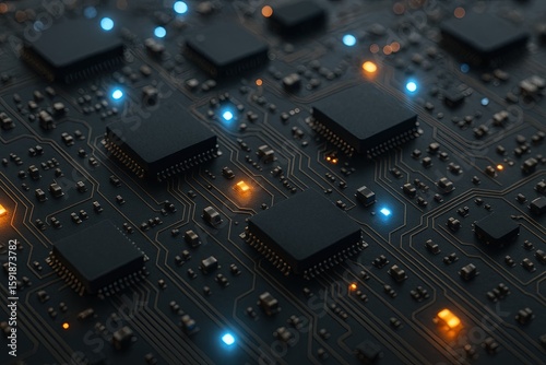 Close-up view of a detailed computer motherboard with microchips and electronic components.
