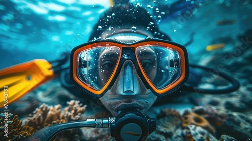 Close-up view of a dive mask being prepared for an underwater adventure The mask is orange in color and has a clear to provide an unobstructed view of the vibrant marine life