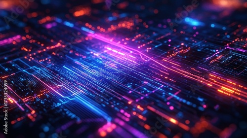 Close-up view of a glowing futuristic circuit board with intricate neon blue, purple, and orange lights conveying a high-tech and digital atmosphere