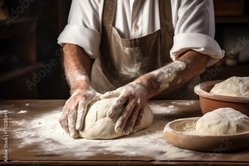 Close-up view of a male hands kneading dough on a board sprinkled with flour.