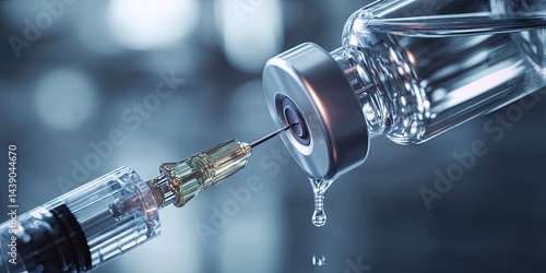Close-Up View of a Medical Syringe Preparing for Injection from a Glass Vial with Blurred Background Offering Healthcare and Vaccination Concepts