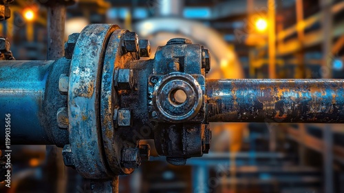 Close-up view of a metallic pipe valve with rust and corrosion in an industrial setting illuminated by warm lighting