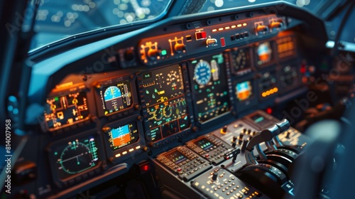 Close-up view of a modern aircraft cockpit with illuminated controls and navigation displays during an evening flight.