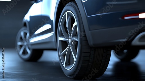 Close-up view of a modern car tire showcasing its design and texture, emphasizing automotive engineering and vehicle performance.