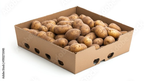 Close-up view of a pile of freshly harvested potatoes in a worn cardboard box, creating a rustic aesthetic on white