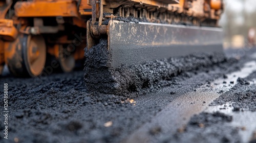 Close-up view of a road construction machine laying down fresh asphalt, creating a smooth surface for road development.