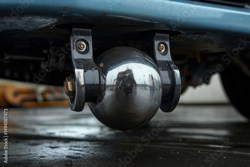 Close-up view of a shiny black tow hitch ball mounted under a vehicle on a wet surface with reflections visible on the ball
